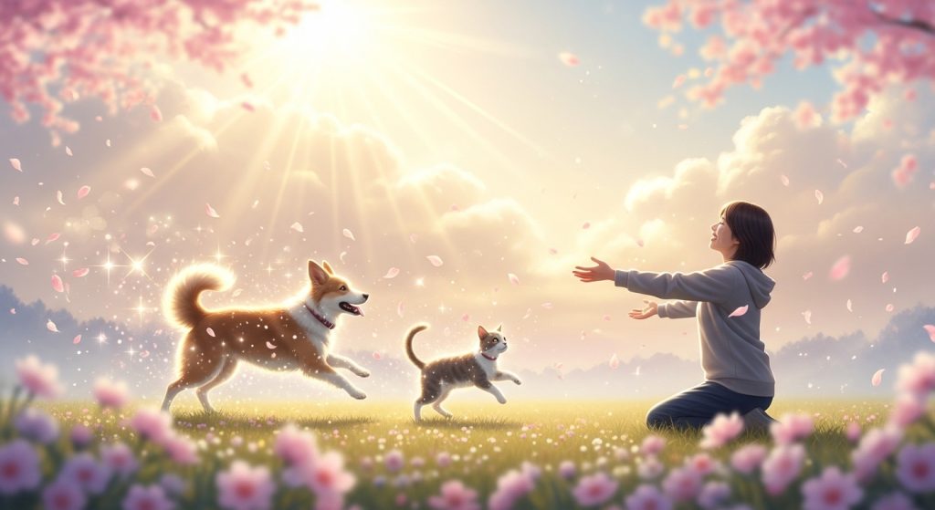虹の橋の伝説では、亡くなったペットたちは天国の手前にある虹の橋で、一番元気だった頃の姿で幸せに暮らしているとされています。夢の中でペットが元気な姿を見せてくれるのは、その場所から「元気でいるよ」「幸せに暮らしているよ」というメッセージを届けてくれているのかもしれません。
