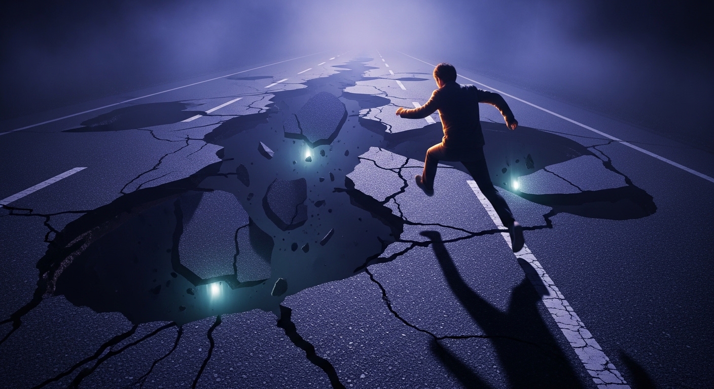 道路が陥没する夢の基本的な意味は、「生活の基盤が揺らいでいること」への警告です。ここでいう基盤とは、経済的な安定、家庭環境、健康状態、人間関係など、日常生活を支えているあらゆる要素を指します。これまで安定していると思っていた何かが実は不安定な状態にあり、それが表面化しようとしていることを夢が教えてくれているのです。
